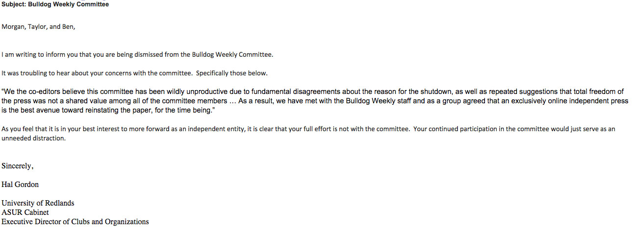 On Dec. 10, the Associated Students of the University of Redlands Cabinet voted 13-2 to put the Bulldog Weekly on hiatus, citing quality issues, “slanted” journalism, monetary concerns, problems with the advising structure and a lack of educational opportunities for Bulldog Weekly reporters.